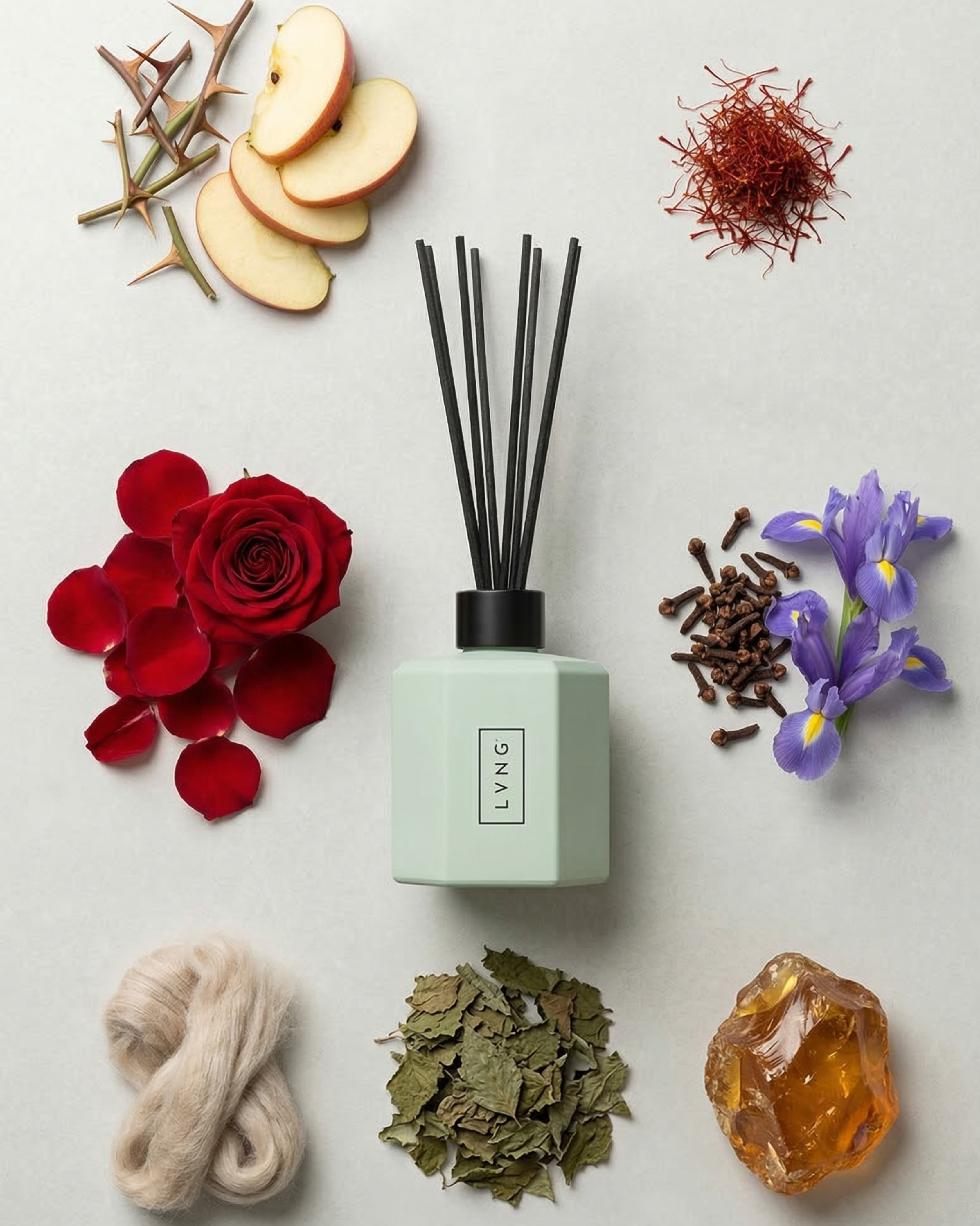 De LVNG Singapore Home Diffuser verspreidt een elegante, oriëntaalse geur met bloemige tonen van roos, warme patchoeli en een subtiele hint van honing. Een verfijnde home fragrance die modern en gelaagd aanvoelt.